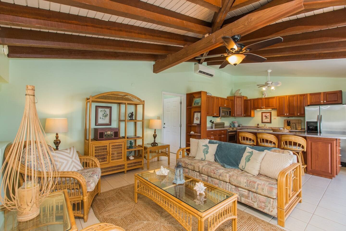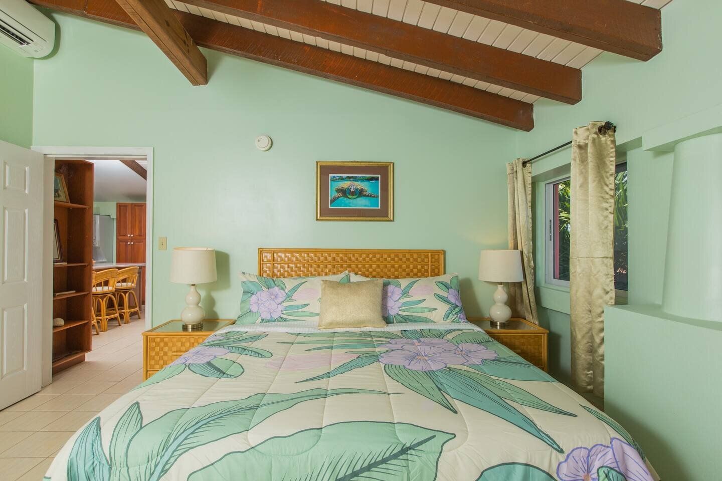 The Frangipani Suite is a custom designed & finished one-bedroom executive suite located on the Island side of the Villa in the northwest corner, offering beautiful ocean & sunset views from its private balcony. As can be seen from the pictures included with this listing the Frangipani Suite is well-constructed with vaulted beamed ceilings and tile floors and has powerful A/C.