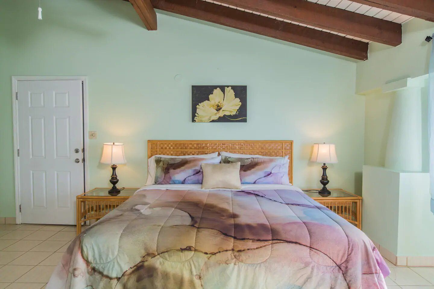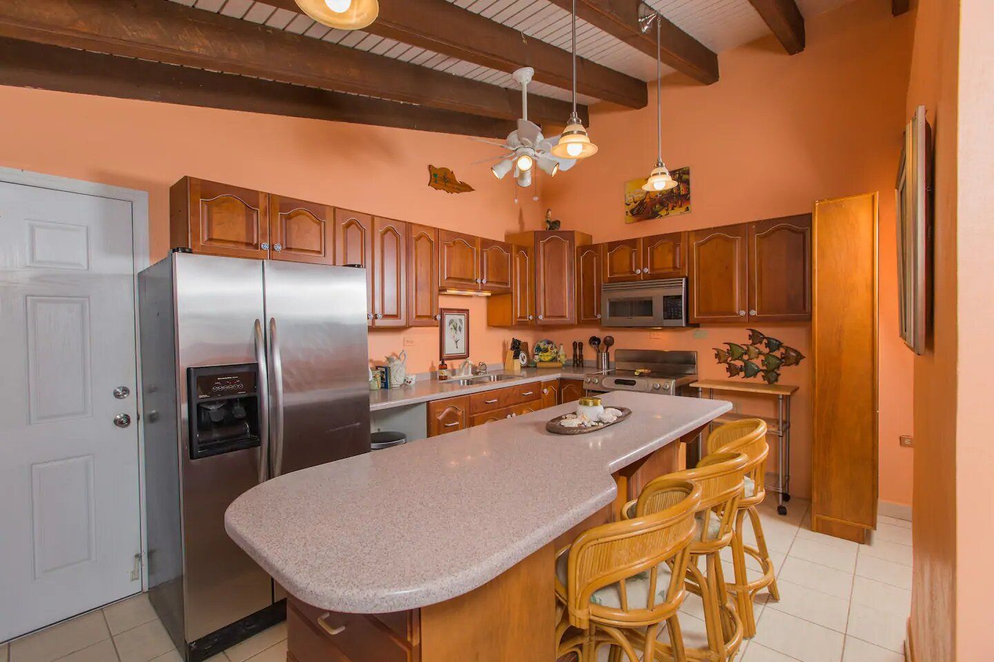 The six residences on the second floor of the Villa Building at Hummingbird Beach Hideaway (HBH) are fully furnished & individually decorated in tropical condo style. The four one-bedroom executive suites & two studios all feature vaulted beamed ceilings & tile floors, with interconnecting double doors through to adjacent rooms which are normally locked but when opened offer a wonderfully spacious & homey flow for family or special events. Each residence is air-conditioned and includes a kitchen area & spacious private bath. Additionally, the one-bedroom executive suites have a spacious sitting area with a private balcony and in the kitchen an Island counter with bar-stool seating, stainless appliances including a full-size range & oven, a refrigerator w/ icemaker, and an in-suite washer/dryer.